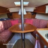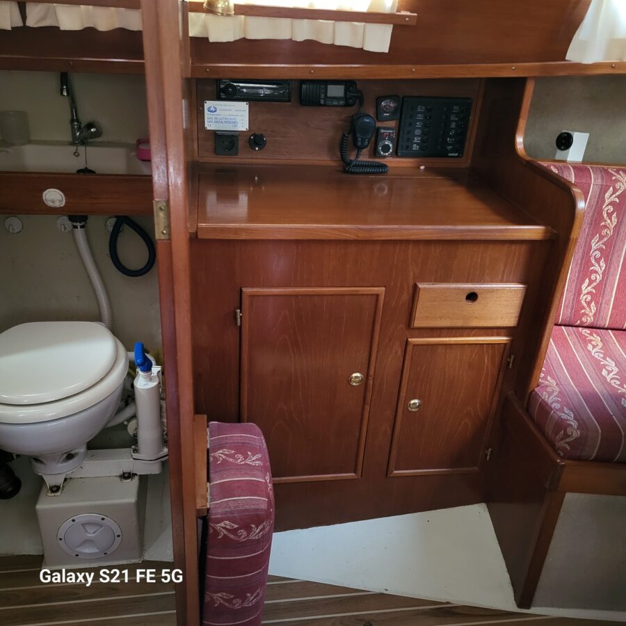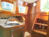 Bruine zeilen bestaande uit rolgenua en doorgelat grootzeil. En halfwinder met slurf. De vallen zijn bedienbaar vanuit de kuip. De buiskap is inclusief een afritsbare achtertent. Een dik winterdekzeil die de gehele boot afdekt. Twee teakhouten zitplaatsen in hekstoel. Ruime tweepersoons slaapkooi in achterschip. Een grote en een kleine bakskist. Toilet plus wasgelegenheid. Driepits gastoestel met oven. Ingebouwde koelkast. Extra tafel voor de afwas. Hete lucht verwarming. Vetus 3 cilinder 25 PK motor inclusief drieblads schroef. 2 Accu’s met scheidingsrelais en oplaadinrichting. 220Volt walaansluiting. Tevens zijn een Kompas, marifoon, radio, dieptemeter, stuurautomaat, GPS plotter en snelheidsmeter aanwezig.