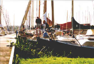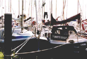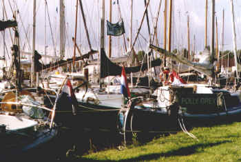 Wir starteten unsere Anreise am Samstag, den 10.7.99 in Workum. Sonntag ging es zügig durch die Schleuse auf das Markermeer. Wind aus der gleichen Richtung. Nach ca 3 Stunden entschlossen wir uns, in Uitdam einen Badestop einzulegen und einige kühle Getränke zu bunkern. Die ersten Midgets, sahen wir hier im Hafen, es waren 20er. Es bestätigte sich später, daß diese auch auf dem Weg zur Reünie waren. Was erwartete uns am Treffpunkt Naarden? Wie werden wir in dem Kreis aufgenommen? Die Nacht verbrachten wir in Muiden, einer Kleinstadt an der Mündung der Vecht. Das Leben und Treiben an einem Sommerabend an der Schleuse war bunt und aufregend. Hier in Muiden liegt auch das Schiff der Königin, wir sollten es am Abend beim Stadtrundgang noch sehen. Der Montag begann schon wieder mit hochsommerlichen Temperaturen. Das Frühstück in der Plicht sollte für die nächsten Tage zur Normalität werden. Wir verließen den Hafen rechtzeitig, um hinter einer kleinen Insel, auf dem Weg nach Naarden, einen Ankerplatz zu suchen. Der Anker hatte sich noch nicht eingegraben, da wurden wir schon von einer Reüniebesatzung schwimmend begrüßt. Das erste Eis war gebrochen. Gegen 16.00 Uhr erreichten wir Naarden. Wir wurden herzlich empfangen und unser Troll von Paul persönlich festgemacht. Ein Schiff nach dem anderen lief ein.