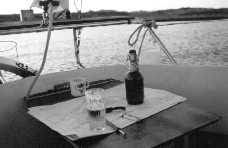 Mit halbem Wind und munterem Seegang die Küste hoch entlang den Kreidefelsen Richtung Thamse Estuary, Kentish knock und Long Sand. Erstaunlich viel Schiffsverkehr in Höhe Margate, allerdings nicht Übersee, sondern eher Küstenmotorschiffe, d. h. als Schiffe noch erkennbar. Ich beschloß zu unterscheiden zwischen Schiffen und Frachtfabriken. Es lief königlich mit 5 –6 kn und ich beschloß es beim Segeln an diesem Tage zu belassen und mit dem Strom zurück nach Ramsgate, um doch noch fish and chips zu fassen. Kentish knock und Long Sand kamen nicht in Sicht. In den Hafen zurück gegen 18.00 , diesmal in eine Box, bezahlt, liegend neben einem Holländer, vertraute Klänge, fish/chips an Bord mit Rest Wein und Grolsch und Genever. Reiseplanung für die Rücktour Samstag/Sonntag nach IJmuiden, dann mit Wind aus W? 6. Tag, 10. 7. 1999, Samstag Zeitig 6.00h auf den Beinen, Wetterbericht auf Kanal 26 ist Fehlanzeige. Auf 198 der Strom ohnehin erst ab 11.00 günstig ist. Später höre ich, daß England alle marifoon-Kanäle in diesem Jahr geändert hat. Nicht sehr charmant. Der Wind, der ist, weht unverdrossen aus nordöstlicher Richtung, im Hafen schätzungsweise mit 2 – 3. Das Weterfax sagt unverdrossen Wind von Westen im Laufe des Tages, also los Richtung Ijmuiden. 7.45 Auslaufen Ramsgate mit einem gewissen mulmigen Gefühl, das aber in dem dann frischen Morgenwind schnell verweht. Es hat sich bereits ein beträchtlicher Seegang vor der Hafenausfahrt aufgebaut in der Nacht, das mögen so 1,5 m sein. Erst nach beisetzen des Großsegels legt sich die Spray so auf die Seite, daß es einigermaßen trocken bleibt in der Plicht. 8.30 frischt es auf bis NE 4, es läuft hart hoch am Wind, vorläufig sieht es nicht nach Änderung aus und die 129 sm bis Ijmuiden sind nur mit beigesetztem Motor ohne eine zweite Nacht zu schaffen. Sollkurs 40°, günstigster Segelkurs 100/350° bei dem Seegang ohne Motor und 80/10° mit Motor. Ich setze das erste Reff, um zu probieren, wie es läuft. Es läuft erheblich besser, weniger Wasser, weniger Gewalt. 12.00 südlich Kentisch knocks setze ich die Fock und fahre 90°, noch 123 sm bis Ijm. Das kann ja heiter werden. Aber das Wasser ist jetzt wieder auffallend blau, es ist sonnig, warm, Dünung länger, 2 – 3, Stimmung hervorragend, wenn der Westwind nicht einsetzt, bleibt immer noch die Option, Lowestoft anzusteuern. Von hier bis Lowestoft noch 56 sm, das bedeutet Ankommen in der Nacht. Das wäre nicht gemütlich. Ich neige doch eher dazu, jetzt ab und durch. Ziel ist, die Reunie pünktlich zu erreichen. Kurs segelnd 85°, also Motor ab. Das läuft jetzt ganz gut, Strom geht mit also 4 –5 kn über Grund 16.00 wieder mit Motor auf Kurs 55°, um den 5 o’clock tea vorzbereiten. Klappt, mit stroopwafels und Genever, Stimmung top, egal was kommt. 17.00 57 m Wassertiefe auf 51°37,3‘/ 2°1,5‘ da kommt schon ein bißchen Watte in die Knie. Das ist ein Graben östlich der North-Falls in N-S-Richtung der etwa 25 sm bis Outer Gabbard geht. Um 17.30 nähert sich ein großes Objekt meiner Kiellinie von S. Im Wasser taucht jetzt viel Tang und besondere Algenformen auf, vermischt mit Holz Resten, Plastikflaschen, Folienresten, Verpackungsmaterial, Tauwerk. Das sieht gar nicht mehr freundlich aus. Das Objekt kreuzt meinen Kurs langsam ca 300 m vor mir und ist ein rostiger, riesiger schätzungsweise 150 000 t Kahn, mit irgendwelchen nicht identifizierbaren Aufbauten und heißt EUROPE MINERAAL und fährt unter belgischr Flagge. Ich würde mich nicht wundern, wenn er Sondermüll-Verbrennungs-Schlacken verklappt. Hier draußen ist außer mir niemand. Aber ehe ich das so richtig realisiere, ist er schon zu weit zum photographieren. Aber ich sehe ihn noch 2 Stunden lang. Noch 108 sm bis IJmuiden. Ich versuche den Holländischen Wetterdienst über Handy zu erreichen, stelle aber verblüfft fest, daß hier draußen keine Netz-Verbindung mehr besteht. Auf den Gedanken, Kontakt mit der Europe Mineraal zu versuchen bin ich merkwürdigerweise nicht gekommen ! Merke... 20.00 Vorbereiten auf die Nacht. Lowestoft ist jetzt erledigt. Endgültig Ijmuiden ansteuern, entlang der separation zone, die jetzt etwa 5 sm östlich durch einige Schiffs-Bewegungen in Sichtweite kommt. Nachts wird ohnehin der Motor beigesetzt wegen Licht, Batterie und autohelm, sodaß ich auf Kurs 55° gehen kann. Die Fock lasse ich stehen, weil sie vom Toplicht angestrahlt wird. Ansonsten einige Vorbereitungen auf die Nacht: Warme Sachen, Ölzeug, Geräte-Beleuchtung, Positionslichter checken, Getränke, Knabberzeug, Karten zurechtlegen. Die Nacht kommt nicht plötzlich. Erst um etwa 23.30 verschwindet der Horizont, wird das Wasser schwarz und häufen sich die Lichter. Das ist die kritische Phase, wo ich regelmäßig den Wald vor lauter Bäumen nicht sehe. Aber glücklicherweise ist alles weit weg und genug Zeit zum Sortieren. Überraschend stelle ich fest, daß nicht nur an steuerbord Lichtbewegungen sind, sondern auch mitschiffs voraus und nach achtern, ja sogar an backbord, wo eigentlich alles schwarz sein müßte. Ich kann mir daraus keinen Reim machen und bin reichlich irritiert, weil ich vorher bis auf die Europe Mineraal backbord nichts gesehen hatte. Und auch die habe ich schon längere Zeit hinter mir gelassen. Irgendwann sehe ich achtern grün-rot, langsam sich vergrößernd, also auf mich zufahrend. Dann verschwindet grün langsam, und das Objekt passiert mich nach 30 min steuerbord. Gegen 1.00 überschlagen sich einige Ereignisse: Wieder rot-grün von hinten, sich nähernd, schiebt sich so langsam von steuerbord heran, daß ich annehme, er fährt fast meine Geschwindigkeit. Als er auf meiner Höhe ist, fast gleich schnell, nähert er sich mir, so daß ich abdrehe, um auszuweichen, sobald es mir unheimlich wurde. Nach etwa 30 min nehme ich wieder den alten Kurs. Er ist immer noch gleich auf mit mir, und nähert sich erneut. Das ging noch eine ganze Weile so. Erst um 3.00 entfernt er sich nach E. I
